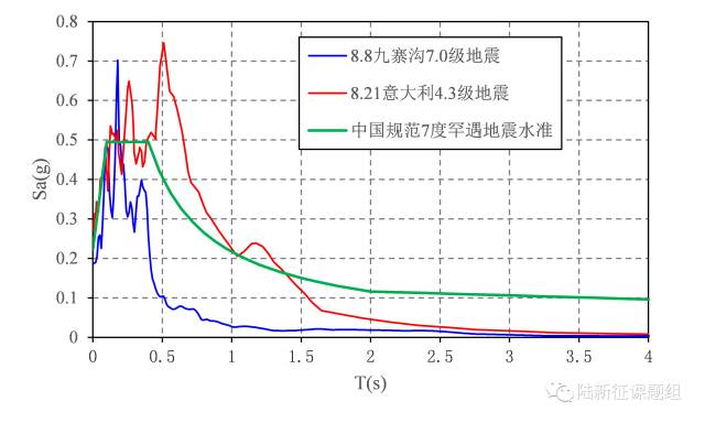圖4 8.8九寨溝7.0級地震和8.21意大利4.3級地震震中附近反應(yīng)譜對比