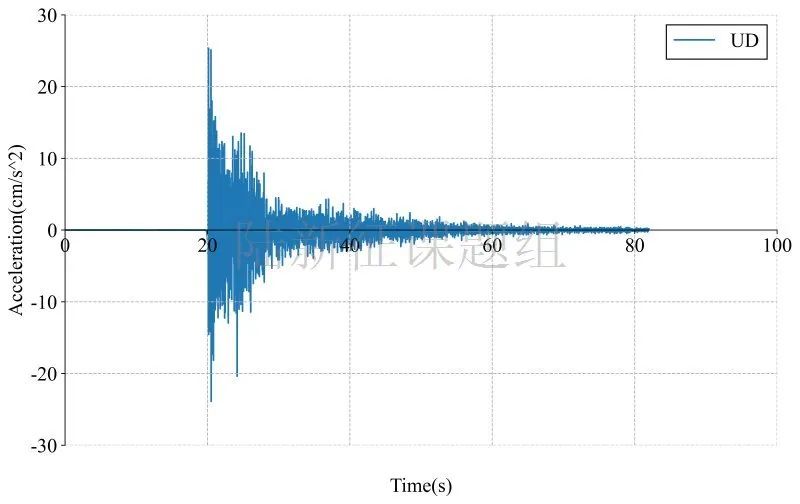 65JIG記錄臺(tái)站位置北緯39.82度,東經(jīng)74.10度(圖1,其中紅色標(biāo)記為震中位置),記錄到水平向地震動(dòng)峰值加速度為53.19cm/s/s,豎直向地震動(dòng)峰值加速度為25.36cm/s/s。該地震動(dòng)及反應(yīng)譜如圖2、圖3所示。