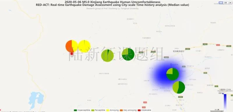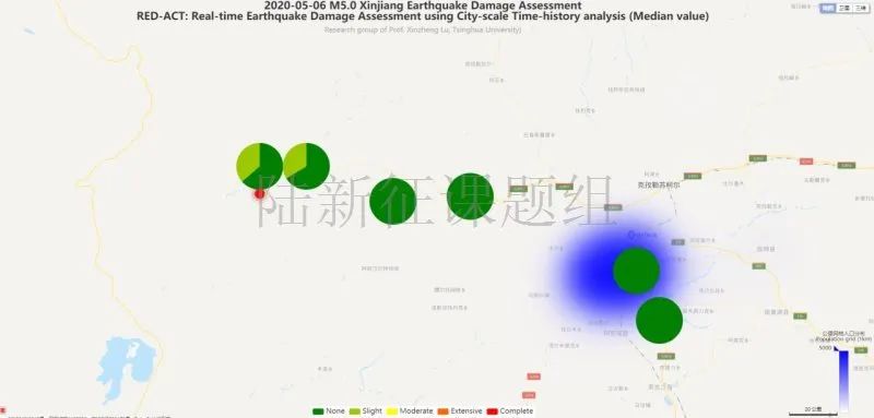 利用密布強(qiáng)震臺(tái)網(wǎng)在震后獲取的實(shí)時(shí)地震動(dòng)信息,再結(jié)合城市抗震彈塑性分析,就可以得到地震發(fā)生后不同地點(diǎn)的建筑破壞情況,為抗震救災(zāi)決策提供科學(xué)支撐。圖4為根據(jù)20200506新疆克孜勒蘇州烏恰縣5.0級(jí)地震震中附近范圍內(nèi)臺(tái)站記錄分析得到的建筑震害分布示意圖。圖5為根據(jù)20200506新疆克孜勒蘇州烏恰縣5.0級(jí)地震震中附近范圍內(nèi)臺(tái)站記錄分析得到的人員加速度感受分布示意圖。