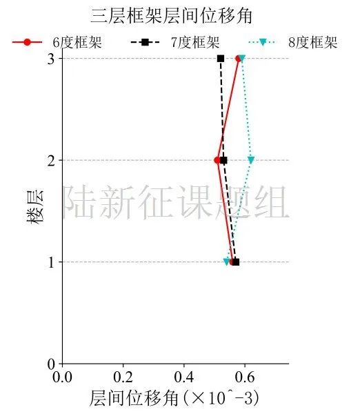 將65JIG臺(tái)站記錄輸入立面布置如圖7 (a)所示的6度、7度和8度設(shè)防的典型三層鋼筋混凝土框架結(jié)構(gòu),得到其層間位移角包絡(luò)如圖7 (b)所示。