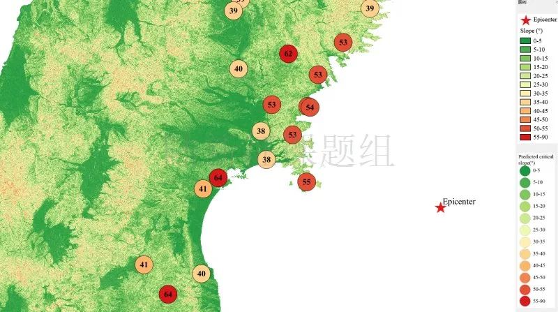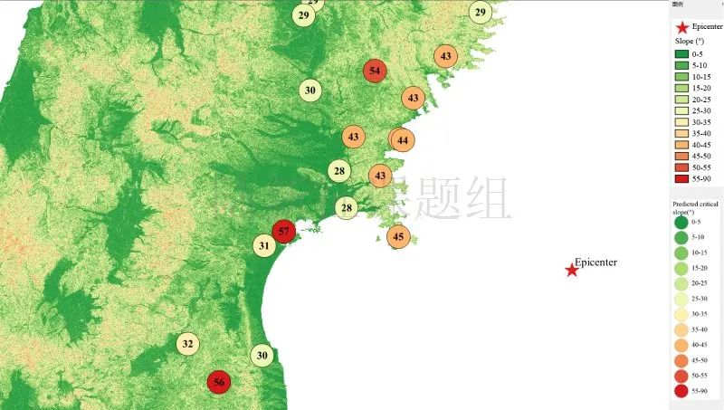 根據(jù)當(dāng)?shù)氐匦螖?shù)據(jù)、巖性數(shù)據(jù)和實(shí)測地面運(yùn)動記錄,可以計(jì)算得到不同滑坡體飽和比例下的滑坡分布,如圖6所示。其中,底圖為當(dāng)?shù)仄露确植紙D,每個圓圈代表每個臺站的計(jì)算結(jié)果,圓圈中的數(shù)字代表發(fā)生滑坡的臨界坡度,臺站附近坡度大于該數(shù)值的地方滑坡發(fā)生概率高。