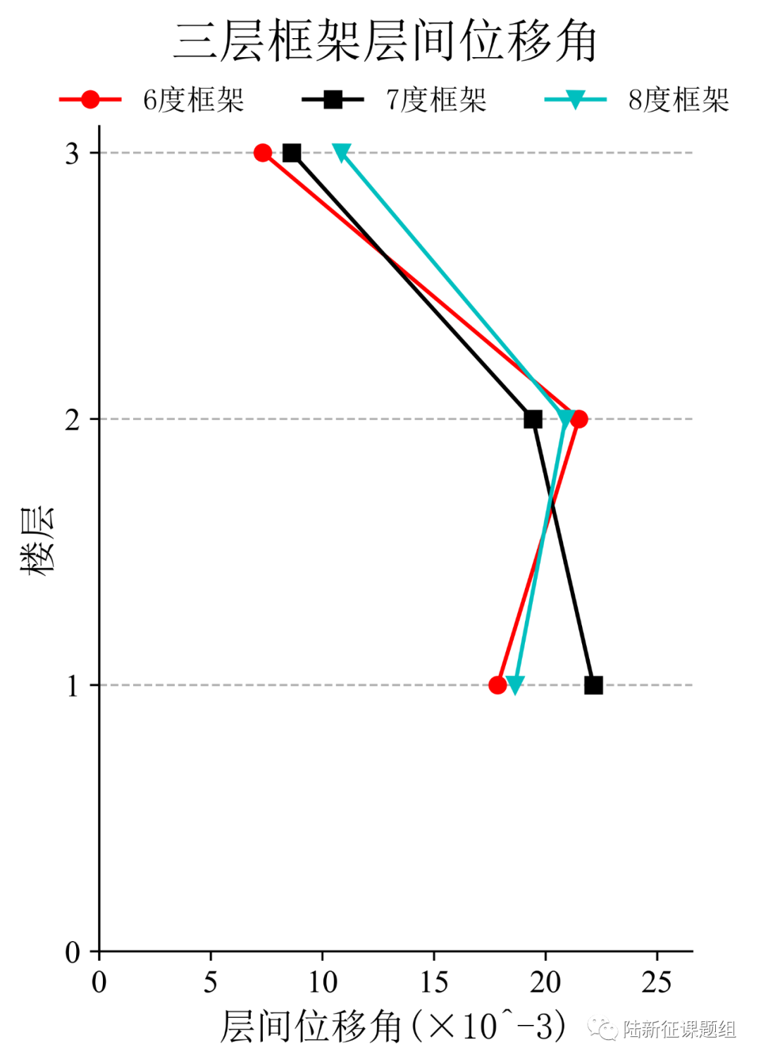 將典型臺站記錄輸入立面布置如圖6(a)所示的6度、7度和8度設(shè)防的典型三層鋼筋混凝土框架結(jié)構(gòu),得到其層間位移角包絡(luò)如圖6(b)所示。