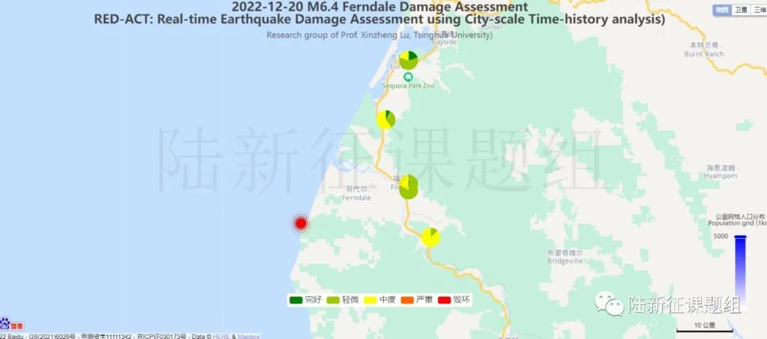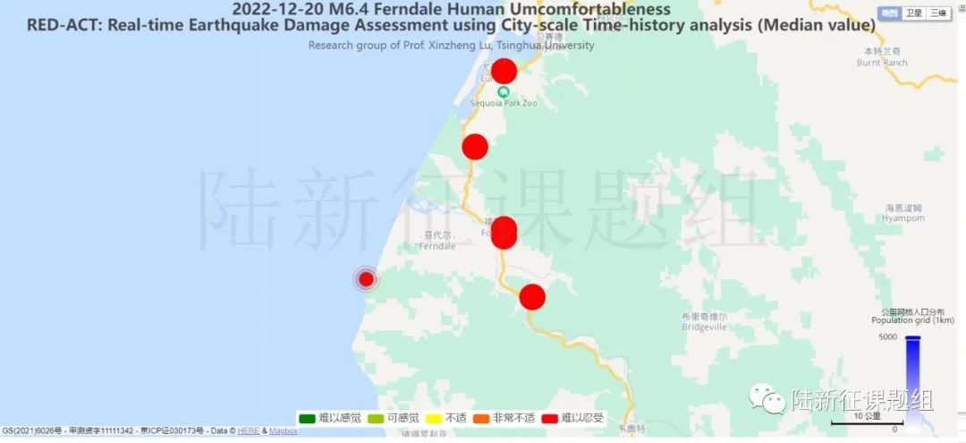 根據(jù)中國(guó)地震學(xué)會(huì)標(biāo)準(zhǔn)《基于強(qiáng)震動(dòng)記錄的地震破壞力評(píng)估T/SSC 1—2021》(參閱新標(biāo)準(zhǔn)發(fā)布 :基于強(qiáng)震動(dòng)記錄的地震破壞力評(píng)估),利用密布強(qiáng)震臺(tái)網(wǎng)在震后獲取的實(shí)時(shí)地震動(dòng)信息,再結(jié)合城市抗震彈塑性分析,就可以得到地震發(fā)生后不同地點(diǎn)的建筑破壞情況,為抗震救災(zāi)決策提供科學(xué)支撐。圖3為根據(jù)本次地震震中附近范圍內(nèi)臺(tái)站記錄分析得到的建筑震害分布示意圖。圖4為根據(jù)本次地震震中附近范圍內(nèi)臺(tái)站記錄分析得到的人員加速度感受分布示意圖。