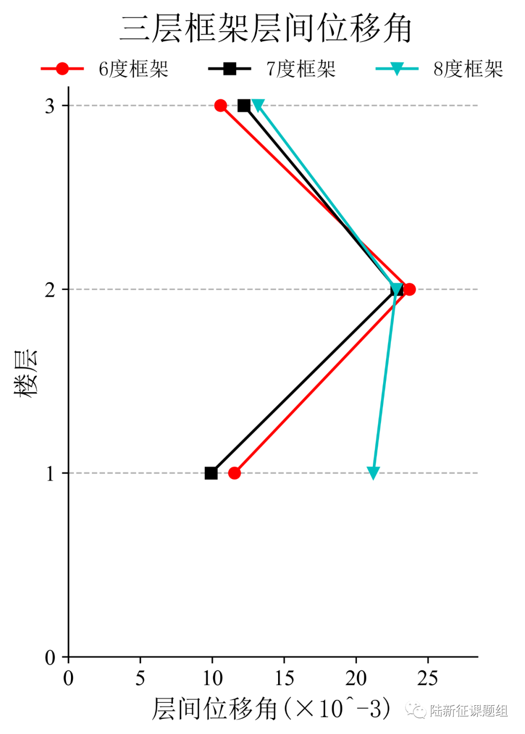 將典型臺(tái)站記錄輸入立面布置如圖5(a)所示的6度、7度和8度設(shè)防的典型三層鋼筋混凝土框架結(jié)構(gòu),得到其層間位移角包絡(luò)如圖5(b)所示。