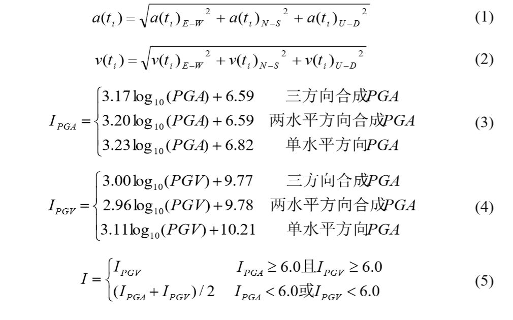 首先根據(jù)式(1)、(2)將三個(gè)方向的地震動(dòng)進(jìn)行合成得到合成地震動(dòng)的PGA和PGV,接著根據(jù)式(3)、(4)和(5)推算得到儀器烈度I、IPGA和IPGV(中國地震局監(jiān)測(cè)預(yù)報(bào)司, 2015)。