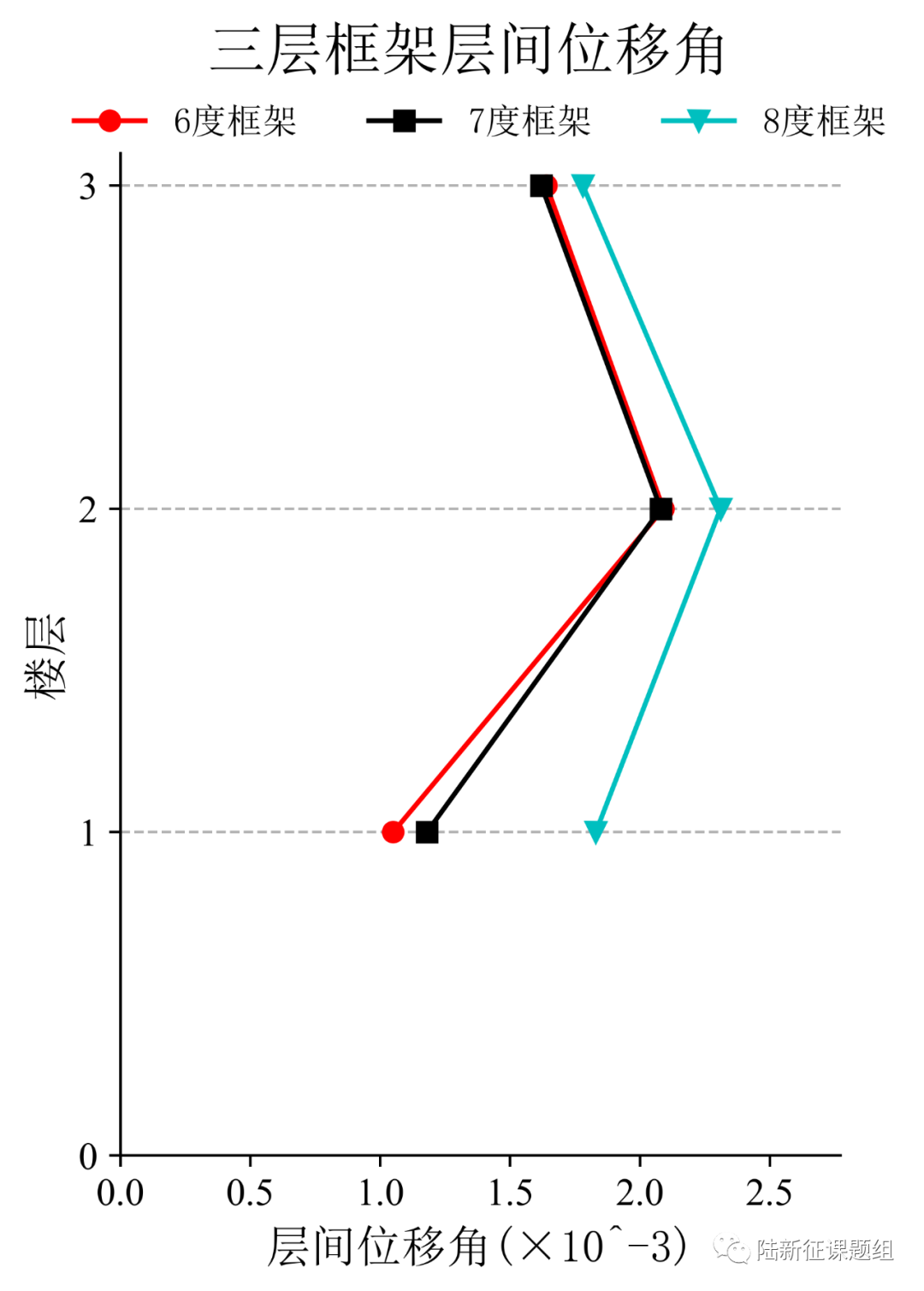 將典型臺(tái)站記錄輸入立面布置如圖6(a)所示的6度、7度和8度設(shè)防的典型三層鋼筋混凝土框架結(jié)構(gòu),得到其層間位移角包絡(luò)如圖6(b)所示。