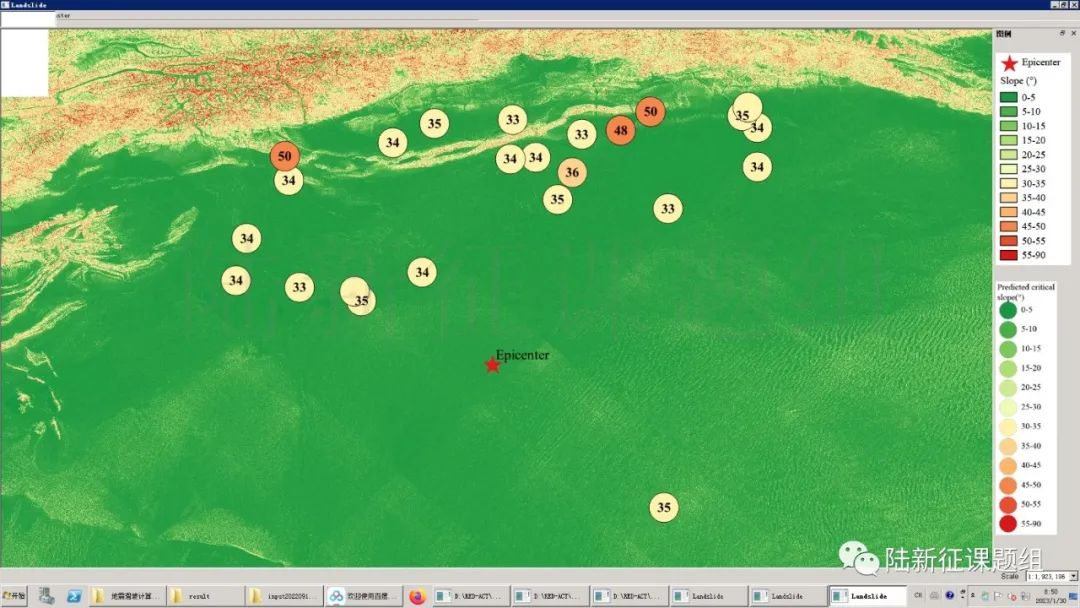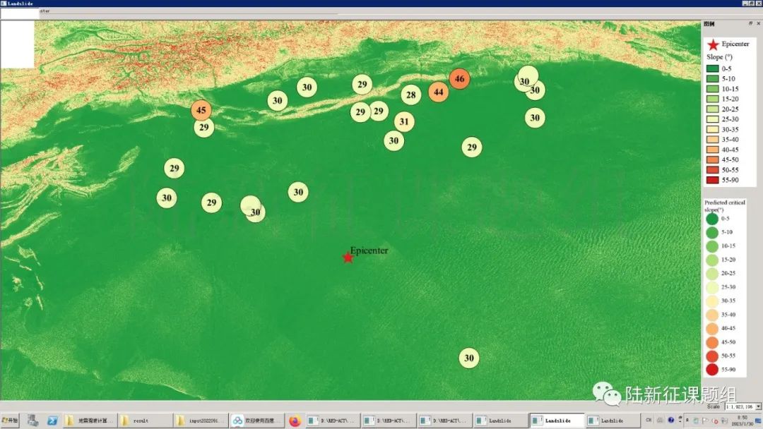 根據(jù)當(dāng)?shù)氐匦螖?shù)據(jù)、巖性數(shù)據(jù)和實(shí)測地面運(yùn)動(dòng)記錄,可以計(jì)算得到不同滑坡體飽和比例下的滑坡分布,如圖5所示。其中,底圖為當(dāng)?shù)仄露确植紙D,每個(gè)圓圈代表每個(gè)臺(tái)站的計(jì)算結(jié)果,圓圈中的數(shù)字代表發(fā)生滑坡的臨界坡度,臺(tái)站附近坡度大于該數(shù)值的地方滑坡發(fā)生概率高。