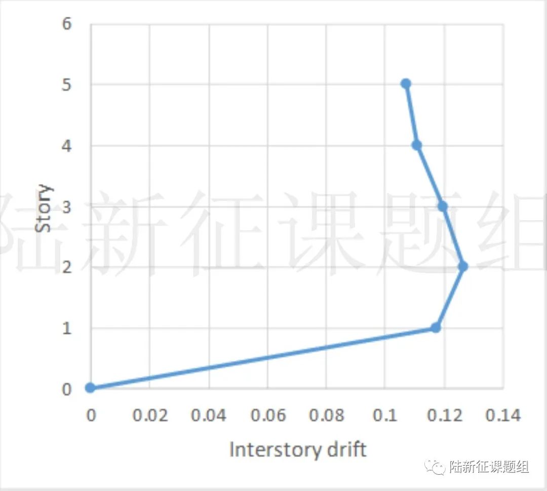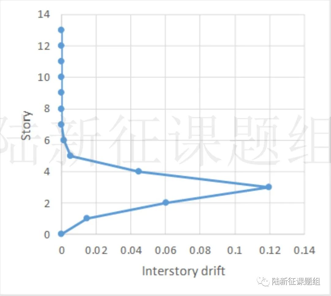 我們將3123臺(tái)站地震動(dòng)記錄輸入該框架,得到結(jié)構(gòu)的損傷狀況和層間位移角包絡(luò)如圖12所示,層間位移角也已經(jīng)遠(yuǎn)超中國抗震設(shè)計(jì)規(guī)范的限值(中國規(guī)范限值2%,計(jì)算結(jié)果為6.7%)。