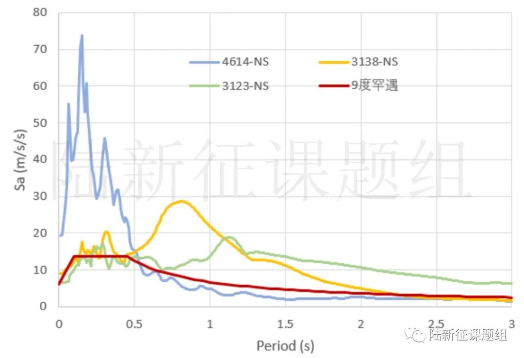 在3138臺(tái)站地震動(dòng)輸入下,居然所有的分析案例都是”毀壞“,于是趕緊把這幾個(gè)地震動(dòng)的反應(yīng)譜繪制出來,如圖1所示。