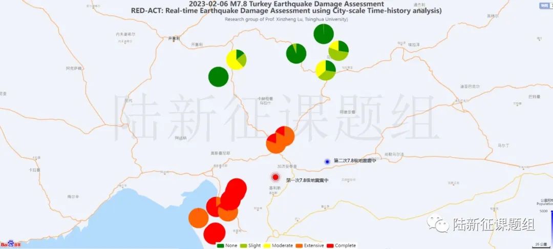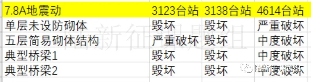 這里肯定有讀者會(huì)問:圖4只是一次7.8級(jí)地震引起的破壞,北側(cè)藍(lán)點(diǎn)(第二次7.8級(jí)地震震中)附近在第二次7.8級(jí)地震后肯定會(huì)遭到很嚴(yán)重的破壞啊!確實(shí),第二次7.8級(jí)地震發(fā)生后,建筑震害肯定會(huì)進(jìn)一步的變化。但是這種破壞肯定和直接遭受一次7.8級(jí)地震作用的結(jié)果不一樣。因?yàn)榈谝淮蔚卣鹨呀?jīng)引起了破壞,第二次地震再來,建筑的破壞會(huì)進(jìn)一步發(fā)展,而兩次地震疊加會(huì)使得問題更加復(fù)雜。那兩次地震疊加后的區(qū)域建筑震害該怎么分析呢?不急,我們有專門研究,請(qǐng)聽下回分解。今天我們只討論第一次7.8級(jí)地震的影響。