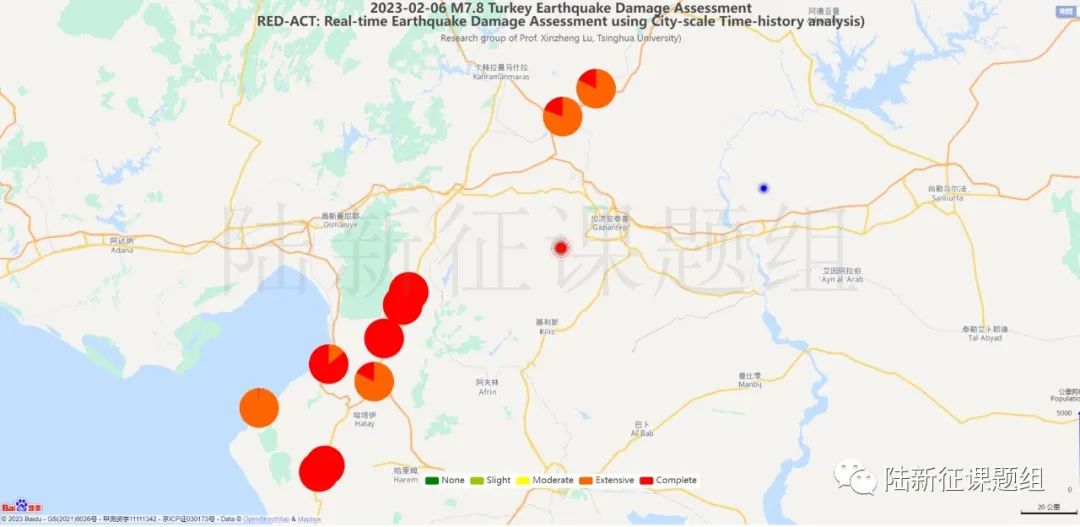 進(jìn)一步,我們采用城市抗震彈塑性分析方法,來研究不同臺(tái)站地震記錄對(duì)區(qū)域建筑的震害作用。由于我們沒有震中附近地區(qū)的建筑數(shù)據(jù),所以我們暫時(shí)用圖2中伊斯坦布爾的區(qū)域建筑數(shù)據(jù)來代替。我們將第一次7.8級(jí)地震的地震動(dòng)數(shù)據(jù)輸入?yún)^(qū)域模型,由城市抗震彈塑性分析方法得到的震中附近建筑震害如圖4、圖5所示。圖中,紅色圓點(diǎn)為第一次7.8級(jí)地震的震中,藍(lán)色圓點(diǎn)為第二次7.8級(jí)地震的震中。