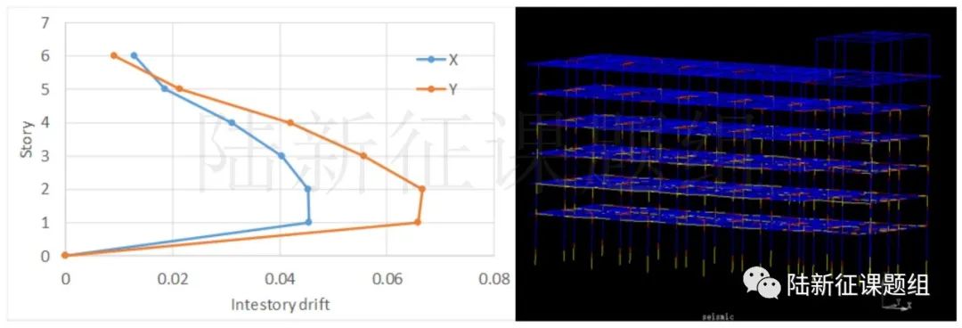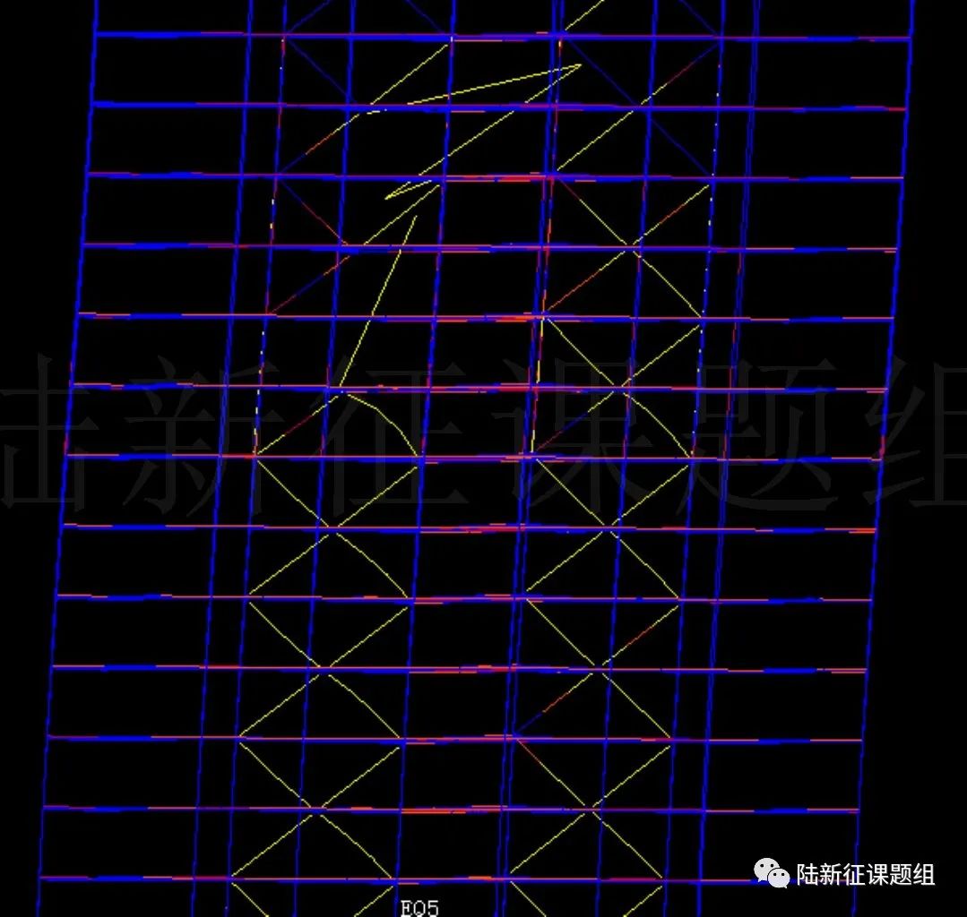圖10中國規(guī)范8度37層鋼框架-支撐結(jié)構(gòu)在3123臺(tái)站地震動(dòng)記錄輸入下的破壞情況(3)鋼框架結(jié)構(gòu)電子院和中建西南院共同設(shè)計(jì)了一個(gè)鋼框架結(jié)構(gòu),為一座6層的辦公樓(附加1層出屋面屋頂),首層與屋頂層高5.0 m,其余層層高3.6 m。設(shè)防烈度為8度,場(chǎng)地類別為II類,用于中美抗震規(guī)范設(shè)計(jì)結(jié)果對(duì)比(圖11)。我們課題組張弛同學(xué)(張弛同學(xué)的優(yōu)秀碩士論文當(dāng)之無愧?。┙⒘似浞蔷€性有限元模型,結(jié)構(gòu)一階周期約為2.2s。