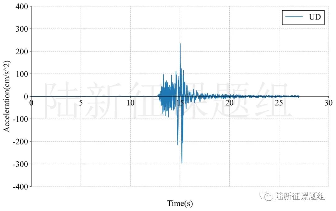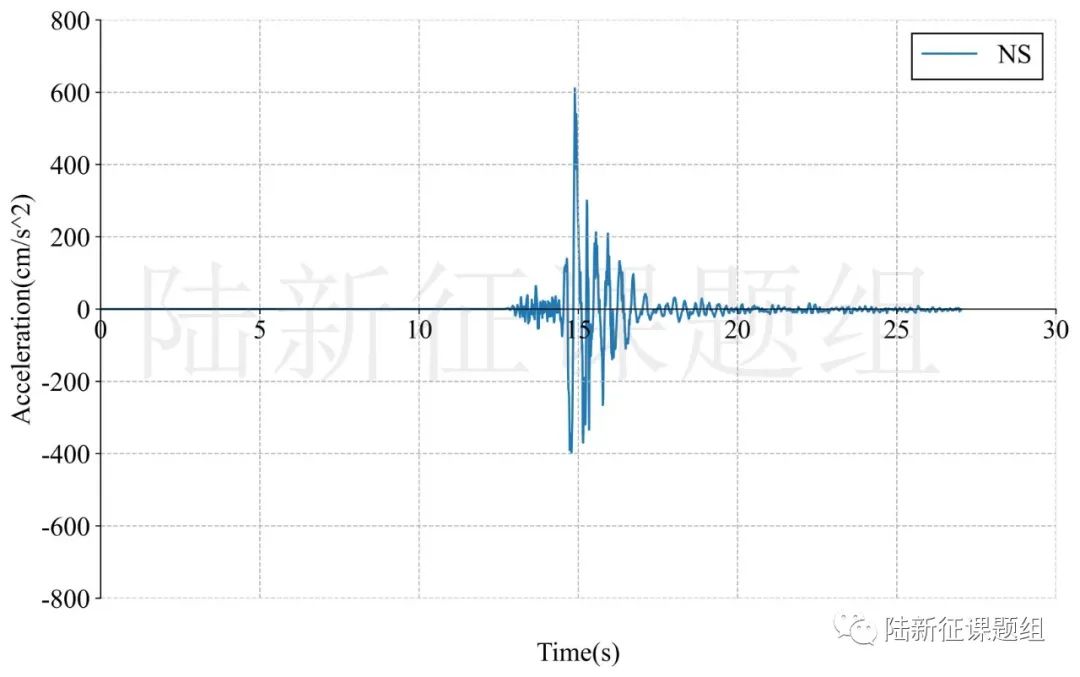 YN.ML003典型臺站位置北緯25.45度,東經(jīng)99.26度,記錄到水平向地震動峰值加速度為684cm/s/s,豎直向地震動峰值加速度為296cm/s/s。該地震動及反應(yīng)譜如圖1、圖2所示。