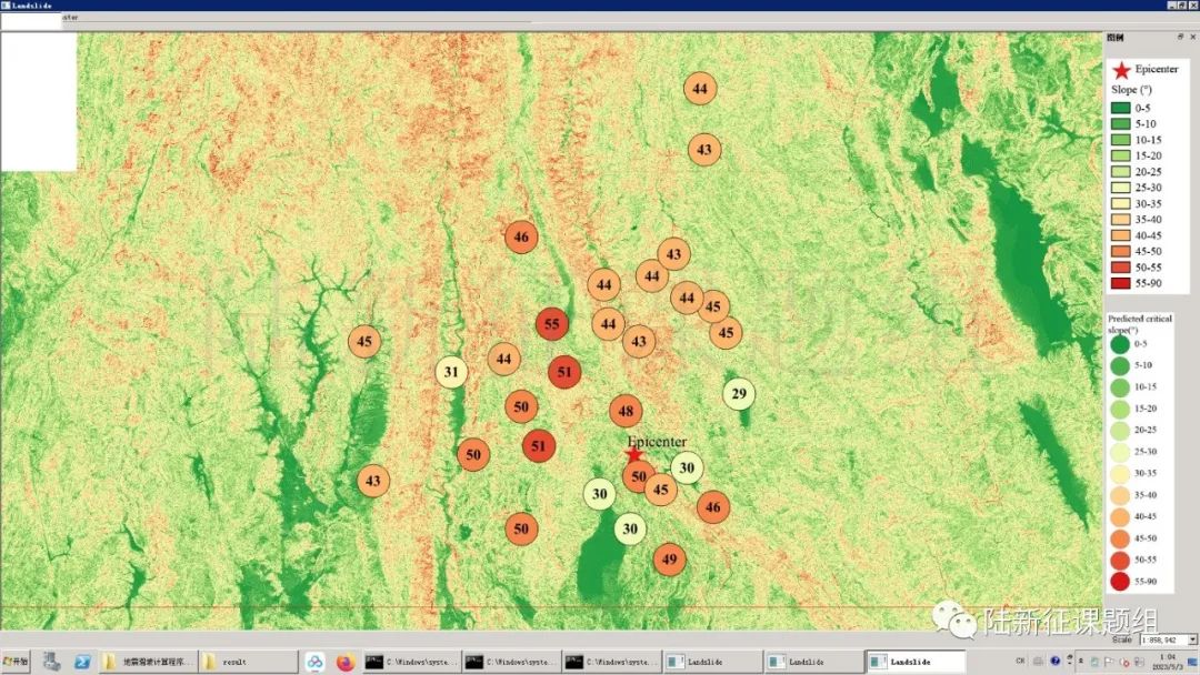 根據(jù)當(dāng)?shù)氐匦螖?shù)據(jù)、巖性數(shù)據(jù)和實(shí)測地面運(yùn)動記錄,可以計(jì)算得到不同滑坡體飽和比例下的滑坡分布,如圖5所示。其中,底圖為當(dāng)?shù)仄露确植紙D,每個(gè)圓圈代表每個(gè)臺站的計(jì)算結(jié)果,圓圈中的數(shù)字代表發(fā)生滑坡的臨界坡度,臺站附近坡度大于該數(shù)值的地方滑坡發(fā)生概率高。
