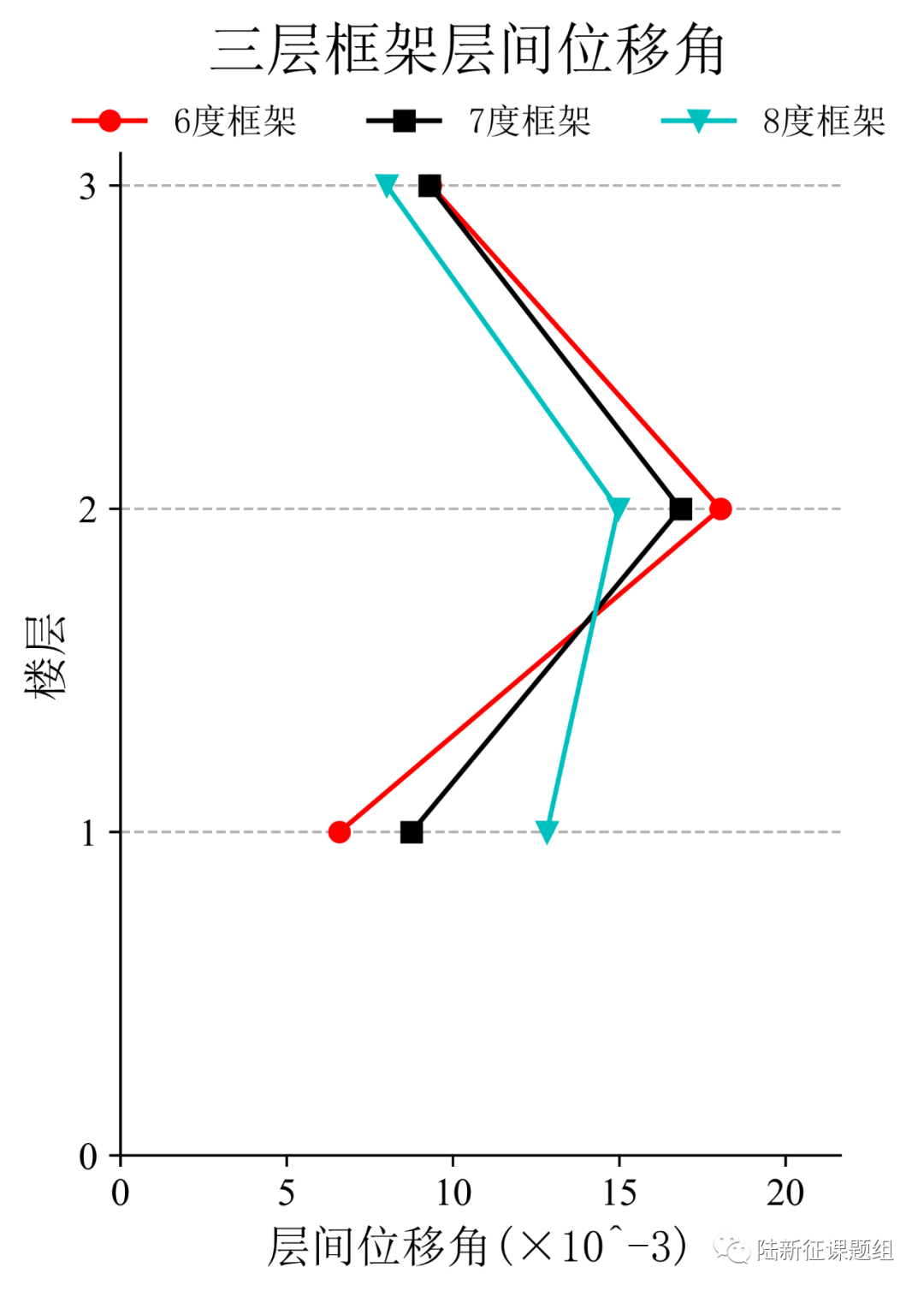 將典型臺站記錄輸入立面布置如圖6(a)所示的6度、7度和8度設(shè)防的典型三層鋼筋混凝土框架結(jié)構(gòu),得到其層間位移角包絡(luò)如圖6(b)所示。